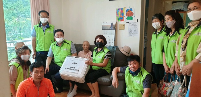 경기 광주시 남종면 지역사회보장협의체는 지난 22일 취약계층 10가구에 폭염 대비 냉방용품을 나눠주는 ‘폭염대비 여름을 부탁해’ 행사를 개최했다. 사진은 행사에 참여한 봉사자들이 지역내 저소득 취약계층 가정을 방문해 여름이불 등을 전달한 뒤 기념촬영을 하는 모습. (사진제공=광주시청)