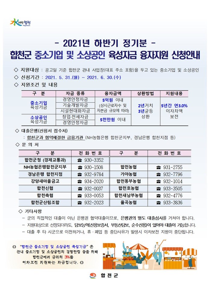 합천군(군수 문준희)은 자금난을 겪고 있는 관내 중소기업과 소상공인의 경영안정과 금융부담 완화를 위해 「2021년 하반기 합천군 중소기업 및 소상공인 육성자금」 융자지원 신청을 5월 31일부터 6월 30일까지 받는다.