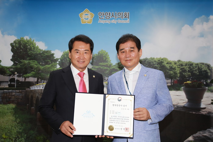 [안양=최휘경 기자] 경기 안양시의회 음경택 의원이 병무청으로부터 대한민국 병역명문가문으로 선정돼 병역명문가 증서와 감사패를 수여받았다.