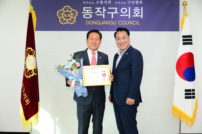 | ▲ 지방의정봉사상을 받은 김명기 의원(왼쪽)이 전갑봉 의장과 기념촬영을 하고 있다. (사진제공=동작구의회) |