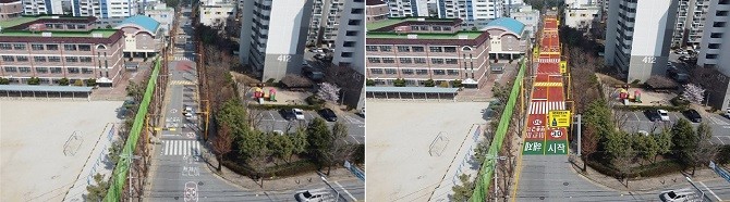 | 어린이보호구역 정비전(좌측 / 운남초등학교)와 정비 후(우측) 전경 / 사진=광주광역시 제공 |