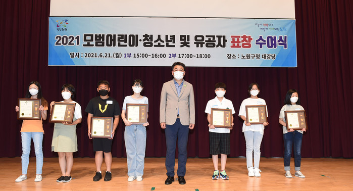 오승록 서울 노원구청장은 지난 21일 진행된 모범어린이·청소년·유공자 표창 수여식에 참석했다. 올해 수상자는 모범어린이 36명, 모범청소년 58명, 모범유공자 19명 등 총 113명이 선정됐다. 사진은 수여식에서 오 구청장(가운데)이 수상자들과 기념촬영을 하는 모습. (사진제공=노원구청)