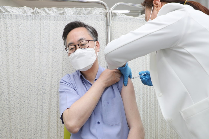 유성훈 서울 금천구청장이 20일 금천구보건소에서 아스트라제네카(AZ) 코로나19 백신을 접종받았다. 사진은 유 구청장(왼쪽)이 백신을 접종받고 있는 모습. (사진제공=금천구청)