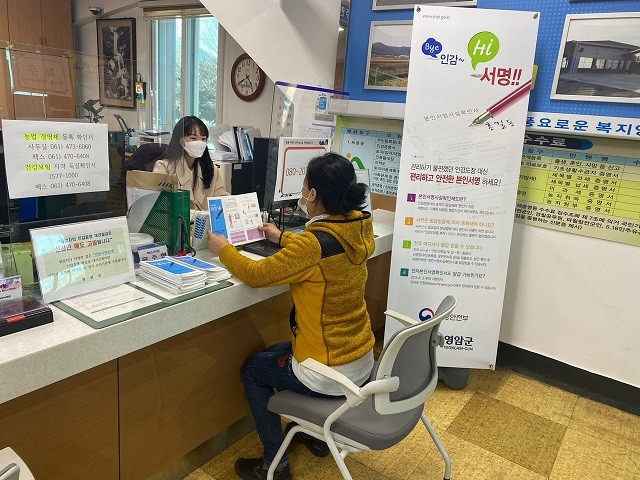 | ▲ 영암군 관계자가 민원실을 찾은 지역민에게 인감증명서 효력이 동일한 본인서명 사실 확인서 발급 향상을 위해 홍보하고 있다. / 영암군 제공 |
