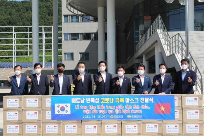 전남도의회는 18일 코로나19 재확산으로 어려움을 겪고 있는 해외교류의회 베트남 빈픅성 인민의회에 마스크 1만장을 전달했다.