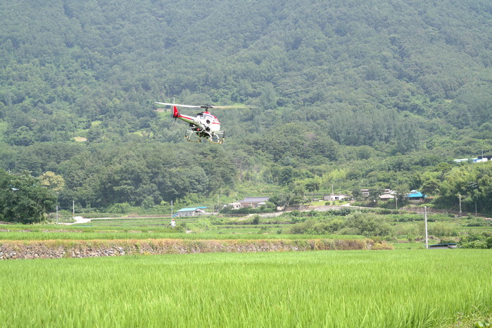 군은 벼 병해충 적기 방제를 통한 농가소득 증대는 물론 농촌인구 고령화에 따른 노동력 부족 해소 및 농약 중독 예방을 위하여 약 2천3백ha의 면적에 총 3차에 걸쳐 무인헬기를 이용한 공동방제를 매년 실시해 오고 있다.