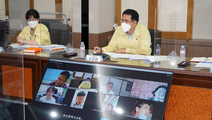 오승현 부산광역시교육청 부교육감이 9일 오전 10시 시교육청 제1회의실에서 김광수 시교육청 교육국장과 감염병 전문의 등 감염병대책자문위원 11명이 참여한 가운데 줌(Zoom)을 활용해 ‘부산시교육청 감염병대책자문위원회 회의’를 열어 회의를 주재하고 있다.