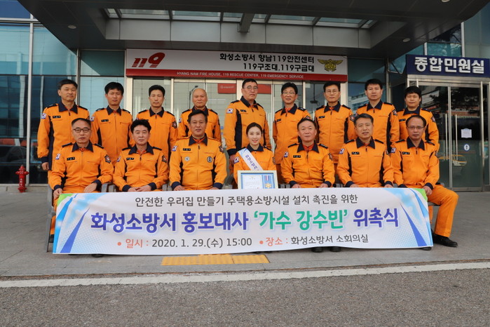 경기 화성소방서가 29일 소방서 회의실에서 긍정적이고 친근한 소방서 이미지 조성과 주택용소방시설 설치 촉진을 위해 가수 강수빈씨를 홍보대사로 위촉했다. 강씨는 앞으로 1년간 홍보대사로 활동할 예정이다. 사진은 관계자들의 기념촬영 모습. (사진제공=화성소방서)