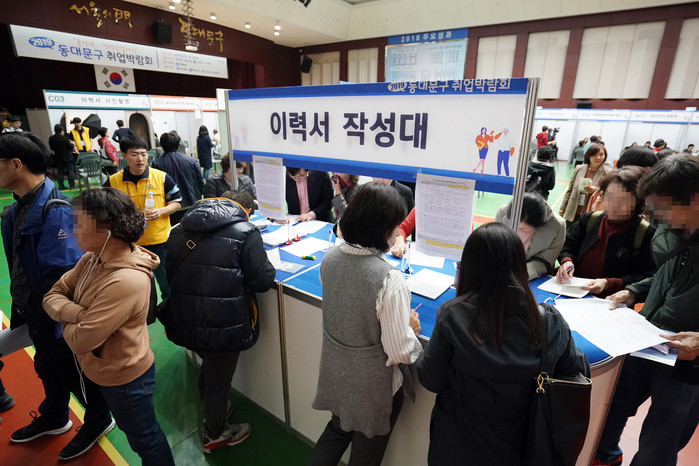 서울 동대문구가 6일 구청 다목적강당에서 광진구청과 동대문여성인력개발센터 함께하는 ‘2019 하반기 동대문구 취업박람회’를 개최했다. 사진은 이력서를 작성하고 있는 구직자들의 모습. (사진제공=동대문구청)