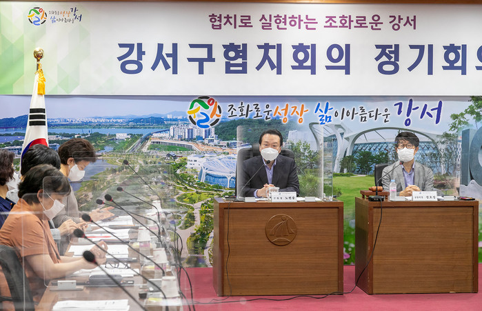 서울 강서구는 5일 ‘2021년 제2차 강서구협치회의 정기회의’를 열고 2021년 지역사회혁신계획 추진 경과 등을 공유하고 2022년 강서구지역사회혁신계획 실행계획(안)을 비롯한 2개 안건에 대해 논의, 의결했다. 사진은 노현송 구청장(가운데)이 회의를 주재하고 있는 모습. (사진제공=강서구청)