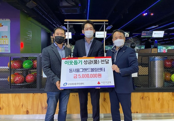 서울 광진구 구의3동 주민센터가 최근 동서울그랜드볼링센터로부터 어려운 이웃을 위한 성금 500만원을 기탁받았다. 동서울그랜드볼링센터는 2016년부터 지역내 저소득층을 위해 볼링양말 판매 수익금을 매년 후원하는 등 따뜻한 선행을 지속해왔다. 사진은 관계자들이 기념촬영을 하는 모습. (사진제공=광진구청)