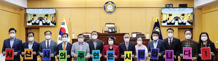 충남 서산시의회 의원들이 최근 본회의장에서 ‘제9회 지방자치의 날’을 기념하는 행사를 열고 ‘서산시의 주인은 시민입니다!’라는 주제로 손피케팅 퍼포먼스를 진행했다. 사진은 퍼포먼스를 하고 있는 서산시 의원들의 모습. (사진제공=서산시의회)