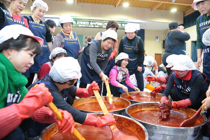 인천 미추홀구는 4일 구청 대회의실에서 다문화가정 고추장 담그기 문화체험 행사를 개최했다. 이날 다문화가정 주부 50여명에게 고추장 담그는 법을 전수하고 만들어진 고추장을 한부모가정 등 160여가구에 전달했다. 사진은 고추장 담그는 모습. (사진제공=미추홀구청)