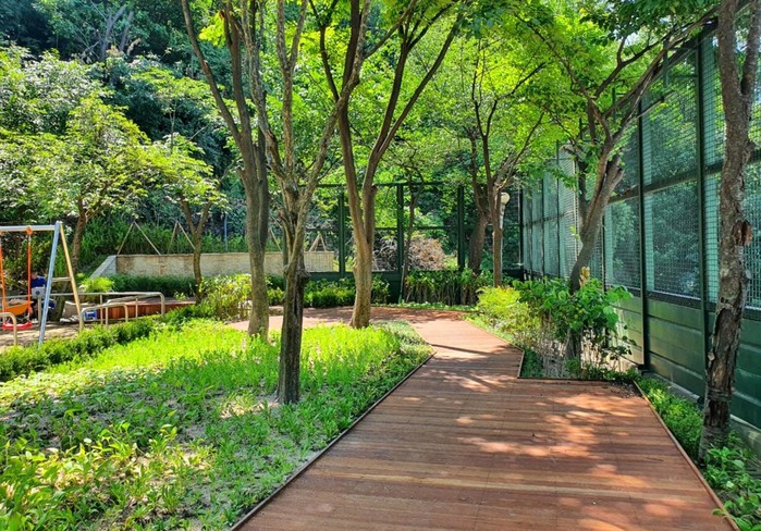 | ▲ '에코스쿨 조성 사업'으로 명지초등학교에 조성된 숲과 덱 로드. (사진제공=서대문구청) |