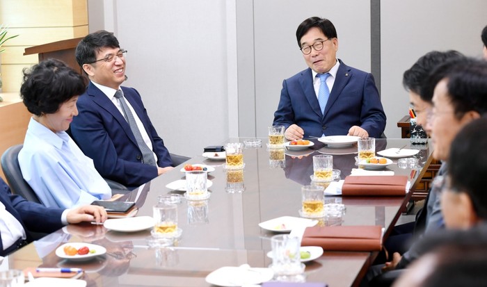 경기 광주시는 최근 코로나19 확산 방지를 위해 민선7기 신동헌 시장의 취임 2주년 기념행사 대신 시장 접견실에서 차담회를 열었다. 이날 신 시장(가운데)과 부시장, 국·소장 등이 함께 차를 마시며 이야기를 하는 모습. (사진제공=광주시청)