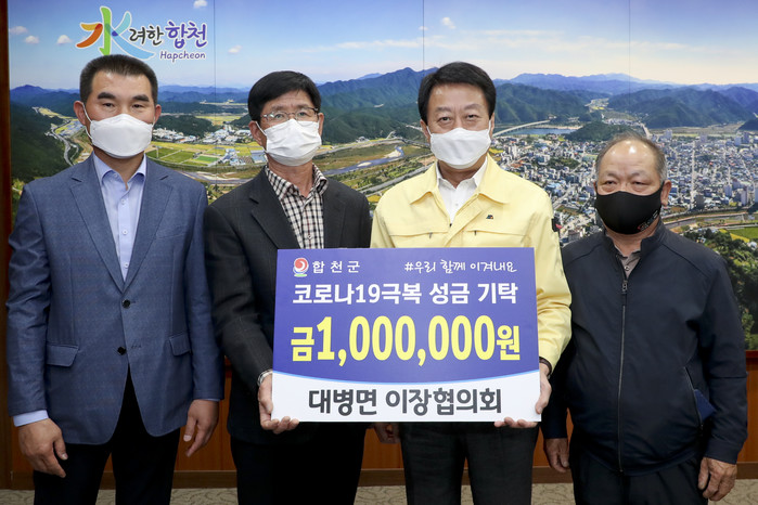 합천군(군수 문준희)은 대병면이장협의회(회장 문석규)에서 지난 8일 합천군청에 방문해 코로나 19로 어려움을 겪고 있는 군민들을 위해 써 달라며 100만원을 기탁했다고 밝혔다.