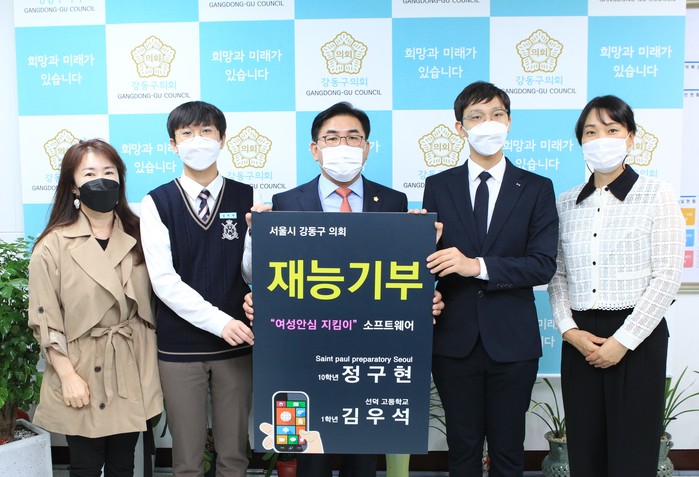 [시민일보 = 이대우 기자] 제갑섭 서울 강동구의회 부의장(천호 1·3동)이 최근 ‘여성안심 지킴이’ 앱 개발을 통해 재능기부를 실천 중인 학생들을 강동구의회로 초대해 감사장을 수여했다.
