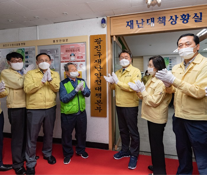 서울 광진구가 여름철 풍수해에 대비하기 위해 지난 15일 구청 안전관리동 1층에 재난안전대책본부를 개소하고 오는 10월15일까지 운영에 들어갔다. 사진은 개소식에 참석한 김선갑 구청장(오른쪽 세 번째) 및 관계자들이 박수를 치고 있는 모습. (사진제공=광진구청)