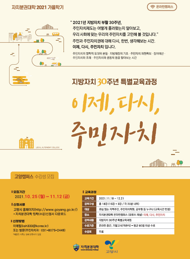 [고양=이기홍 기자] 고양시가 11월 12일까지 자치분권대학 고양캠퍼스 가을학기를 맞아 지방자치 30주년 특별교육과정‘이제, 다시, 주민자치’ 수강생을 모집한다.