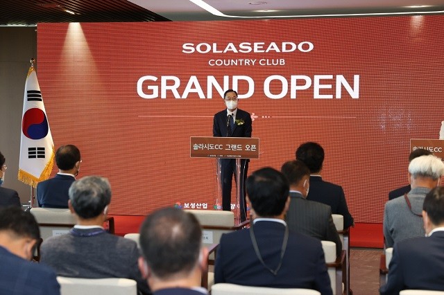 | ▲ 명현관 해남군수가 16일 해남군 산이면 구성지구 내 솔라시도 골프장 개장식 축사를 하고 있다. / 사진=해남군 제공 |