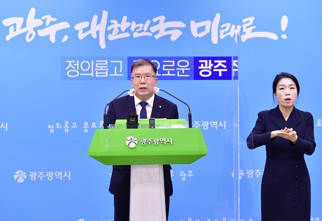 [광주=정찬남 기자] 정민곤 광주도시공사 사장이 25일 오전 시청 브리핑룸에서 첨단3지구 연구개발특구 조성 사업과 관련해 설명을 하고 있다.