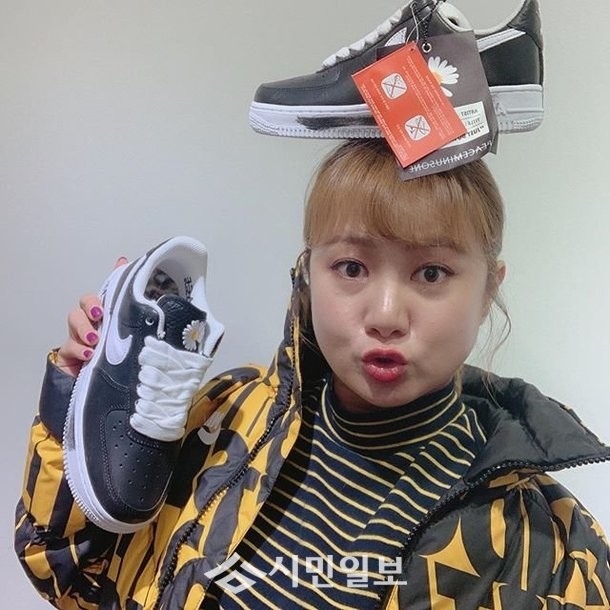 박나래는 인스타그램에 "#나이키 #nike #인싸템 #GD운동화 #에어포스 아까워서 신지말고 머리에 이고 다녀야지...보고있나 이상준 이태경.. 후훗"이라는 글과 함께 사진 한 장을 게재했다.