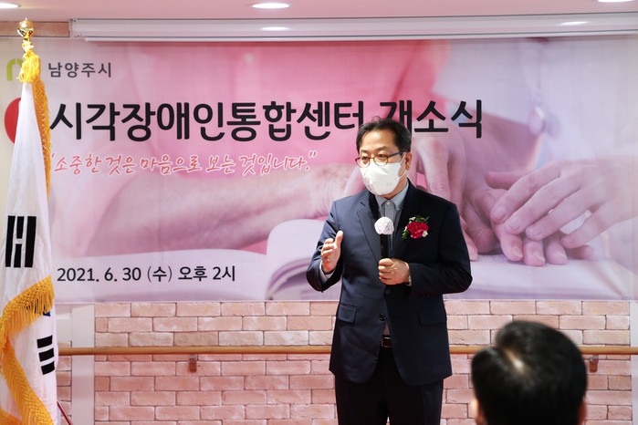 (사)경기도시각장애인연합회 남양주시지회는 30일 전국 최초로 조성된 남양주시 시각장애인통합센터 개소식을 열었다. 개소식에서는 시각장애인의 복지발전 유공자에 대한 표창 수여 및 회원들의 축하공연이 진행됐다. 사진은 이날 행사에 참석한 조광한 시장이 인사말을 하고 있는 모습. (사진제공=남양주시청)