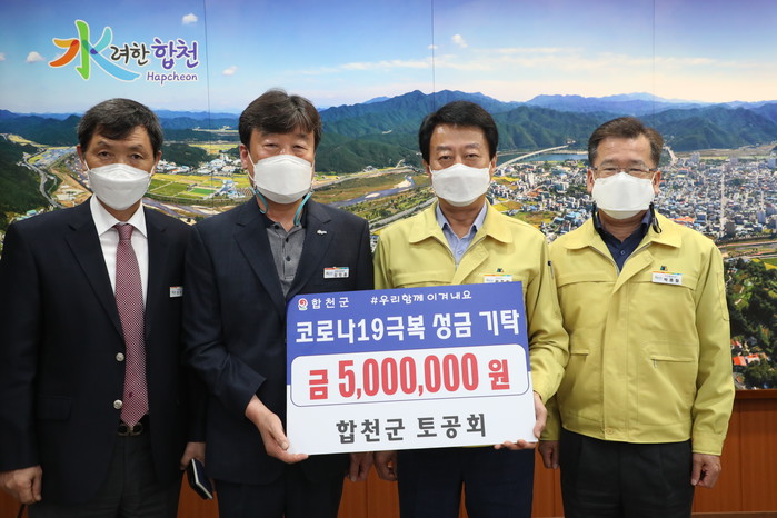 합천군 토공회에서는 “코로나19로 어렵고 힘든 군민을 위해 자발적으로 모은 성금 500만원을 기탁하게 됐다”며 “코로나19가 빨리 종결되기 바라며, 우리의 마음이 군민에게 작은 위로가 되면 좋겠다”고 기탁 소감을 밝혔다.