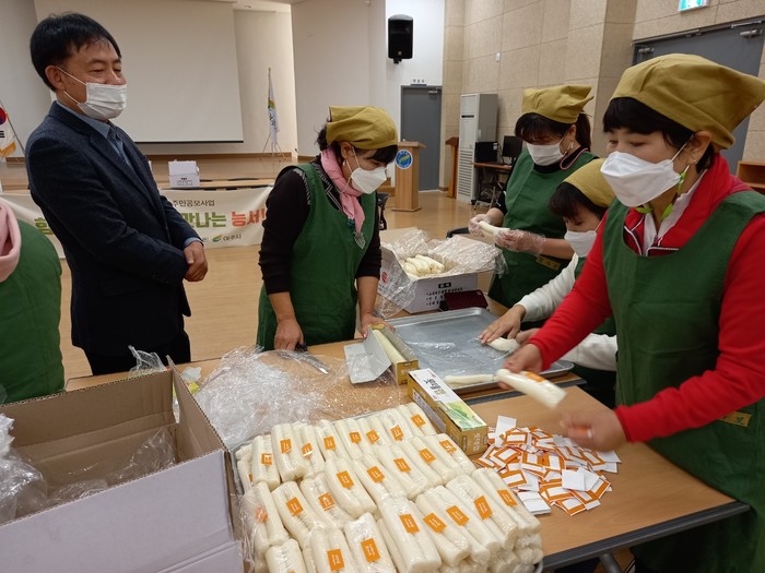 경기 여주시 능서면 생활개선회가 米사모(여주쌀을 사랑하는 사람들의 모임)와 농업인의 날을 기념해 최근 여주쌀로 만든 '가래떡나눔 행사'를 펼쳐 지역내 학교와 농업관련 기관에 가래떡을 전달했다. 사진은 참여자들이 이날 나눔할 가래떡을 포장하는 모습. (사진제공=여주시청)