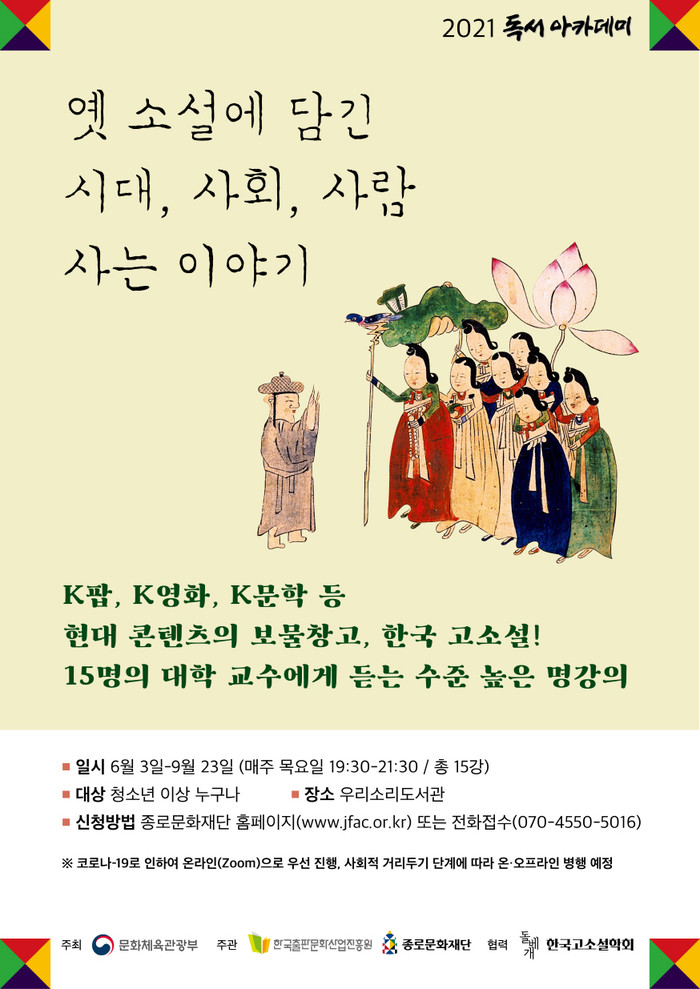 [시민일보 = 이대우 기자] 서울 종로구(구청장 김영종)가 한국영화, 한국문학 등 K콘텐츠의 보고나 다름없는 한국 고소설에 대해 깊이 있게 배울 수 있는 온라인 특강을 오는 6월3일~9월23일 매주 목요일 오후 7시30분 우리소리도서관에서 운영한다.