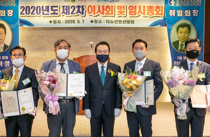 노현송 강서구청장은 7일 더뉴컨벤션에서 열린 ‘강서구상공회 임시총회 및 이취임식’에 참석했다. 이날 행사는 2020년 제2차 이사회, 표창장 수여식 등으로 진행됐다. 사진은 노 구청장(가운데)과 관계자들이 기념촬영을 하는 모습. (사진제공=강서구청)