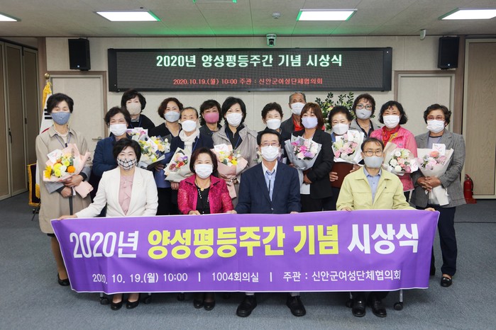 신안군(군수 박우량)은 19일(월) 2020년 양성평등주간을 맞아, 양성평등 향상 유공자 14명 등이 참석한 가운데 신안군여성단체협의회(회장 전진자) 주관으로 군청 1004회의실에서 시상식을 개최했다.