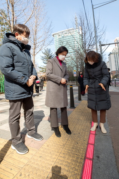 김수영 서울 양천구청장이 지난 23일 서울 목운초등학교 앞에 설치된 스마트 횡단보도를 현장 점검했다. 이 횡단보도는 고해상도 카메라를 활용해 24시간 관제 모니터링이 가능하고 정지선 위반차량과 현재 속도를 LED 전광판에 표출한다. 사진은 김 구청장(가운데)이 목운초등학교 앞 바닥신호등을 확인하고 있는 모습. (사진제공=양천구청)