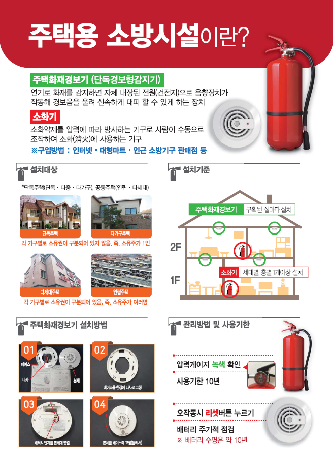 '주택용 소방시설'이란 소화기와 단독경보형감지기를 말하며 법적 의무 설치 대상은 단독주택, 다세대주택, 다가구주택, 연립주택으로 소화기는 세대별, 층별 1개 이상, 단독경보형감지기는 구획된 실마다 1개 이상을 설치해야 한다.