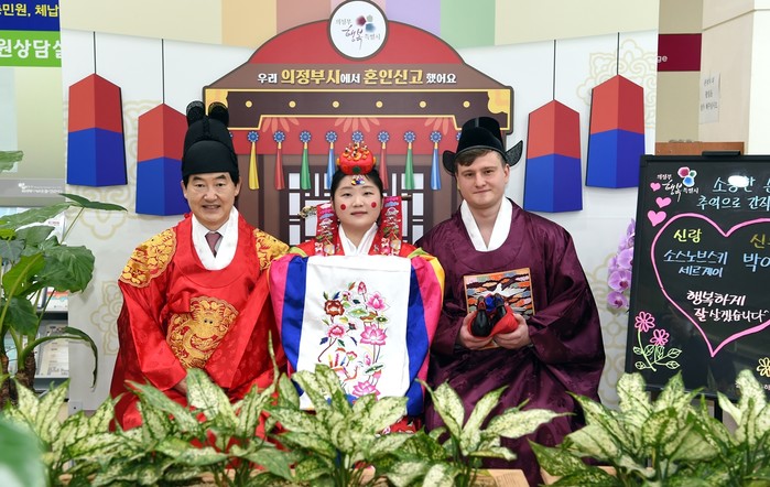 경기 의정부시가 코로나19 장기화로 잠시 중단했던 '시장님과 함께 하는 혼인신고 기념 포토존 인증샷 이벤트'를 최근부터 재개했다. 사진은 이날 인증샷 이벤트에 참여한 다문화 가정이 안병용 시장(왼쪽)과 함께 포토존에서 기념촬영을 하는 모습. (사진제공=의정부시청)