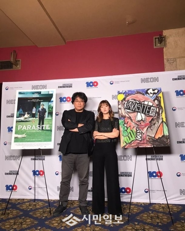 공개된 사진 속에는 기생충의 포스터와 영화에 등장한 그림을 배경으로 감독 봉준호와 박소담이 나란히 서있는 모습으로 이목을 사로잡았다.