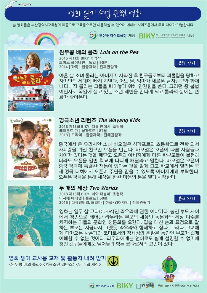 부산광역시교육청(교육감 김석준)은 영화 읽기 수업 활성화를 위해 부산국제어린이청소년영화제(BIKY) 상영작 3편의 판권을 구입하여 부산지역 학교와 학생들이 이용할 수 있는 영화대여 사업을 추진 중이라고 20일 밝혔다.