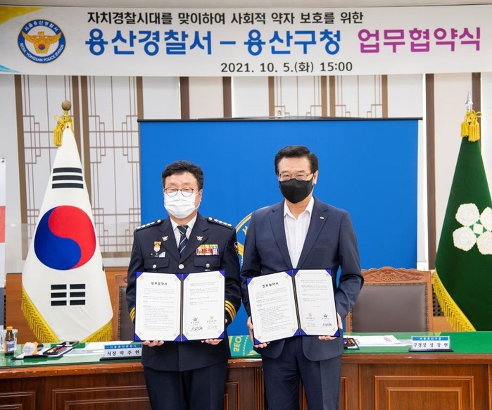 서울 용산구와 용산경찰서가 5일 사회적 약자보호를 위한 업무 협약을 맺었다. 사진은 협약식에서 성장현 구청장(오른쪽)과 박주현 용산경찰서장이 기념촬영을 하고 있는 모습. (사진제공=용산구청)