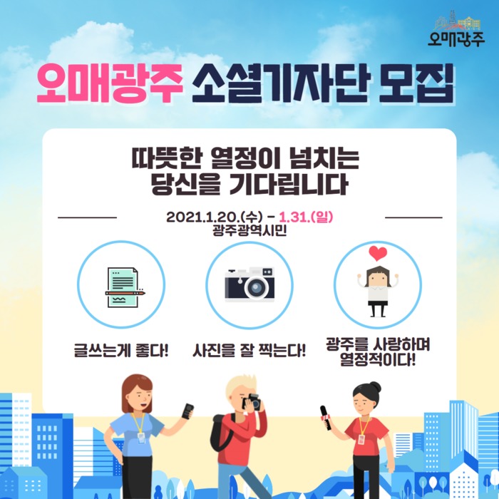 [광주=정찬남 기자] 광주광역시는 올해 광주의 다채로운 다섯가지 매력을 소셜네트워크서비스(SNS)를 통해 열정적으로 체험하고 알릴 ‘제7기 오매광주 소셜기자단’을 모집한다