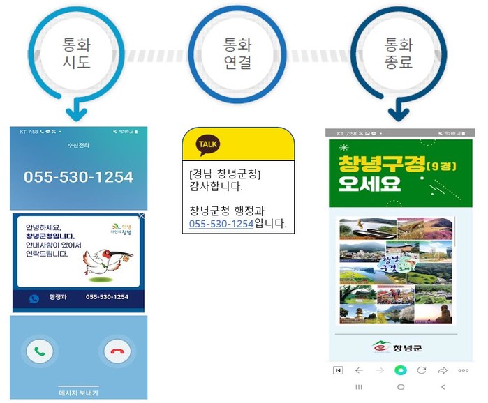 ‘행정전화 스마트 알림 서비스’는 행정전화로 민원인에게 전화를 걸면 통화 시도 중에는 부서 정보를 표시해주고 통화 종료 후에는 군정 소식 화면과 부서정보를 알림 톡(또는 문자)으로 전달해 준다.