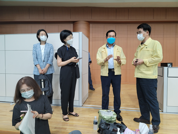 | ▲ 김수규 시의원(오른쪽 두 번째)이 고3 및 교직원 대상 예방접종이 진행되고 있는 동대문구체육관을 방문하여 관계 공무원을 격려하고 있다. (사진제공=서울시의회) |