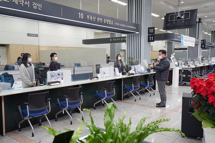유덕열 동대문구청장이 최근 구청 1층 종합민원실에서 일일 DJ로 나서 직원들이 직접 쓴 사연을 읽고 격려와 위로의 말을 전하며 직원들과 소통하는 시간을 보냈다. 사진은 사연을 낭독하고 있는 유 구청장(오른쪽)의 모습. (사진제공=동대문구청)