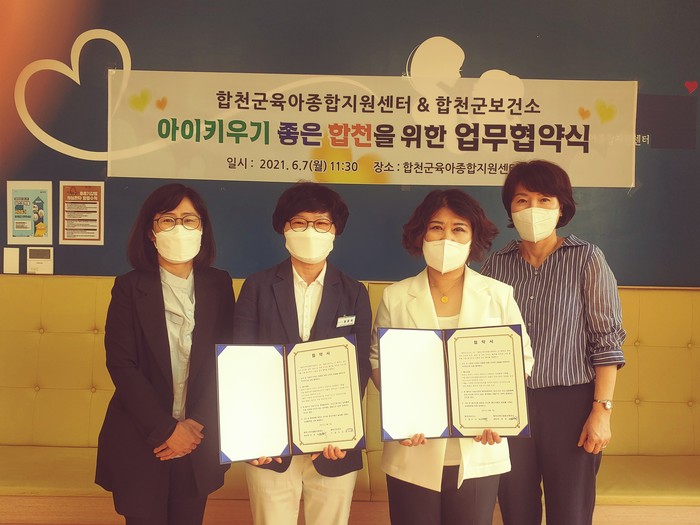 합천군보건소(소장 이미경)는 저출산 극복 및 영유아의 건강한 성장, 발달 및 양육 인프라 발전을 위해 합천군육아종합지원센터(센터장 권윤숙)와 6월7 일 협약식을 가졌다. 합천군 육아종합지원센터에서 열린 협약식에는 이미경 보건소장과 권윤숙 육아종합지원센터장을 비롯한 양 기관 관계자가 참석했다.