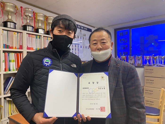 제갈성렬 경기 의정부시 직장운동경기부 빙상팀 감독이 지난 8일 경기도 체육의 발전과 위상 제고를 위해 노력을 기울이고, 빙상 종목의 저변 확대·활성화에 기여한 공로를 인정받아 전문체육부문에 대한 경기도체육회장 표창을 받았다. 사진은 제갈 감독이 표창을 받고 기념촬영을 하고 있는 모습. (사진제공=의정부시청)