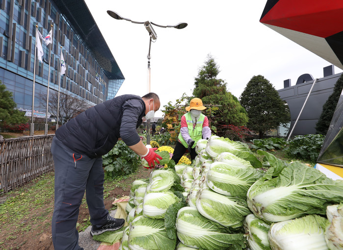서울 용산구가 지난 18일 구청 앞마당 용산마을농원'에서 두 달간 키운 무·배추를 수확했다. 수확한 농산물(무 200개, 배추 120포기)은 용산꿈나무종합타운으로 전달했으며, 이곳에서 김장을 담가 지역내 사회복지시설 및 한부모가정으로 김치를 전달할 예정이다. 사진은 근무자들이 무, 배추를 수확하고 있는 모습. (사진제공=용산구청)