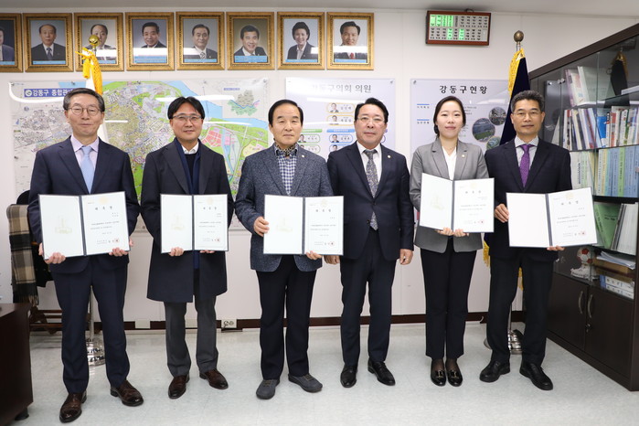 | ▲ 강동구의회가 2019회계연도 결산검사위원을 위촉했다. 사진은 (오른쪽부터)유호상 위원, 진선미 대표위원, 임인택 의장, 이성권·전명철·이강엽 위원이 위촉식 후 기념촬영을 하고 있는 모습. (사진제공=강동구의회) |