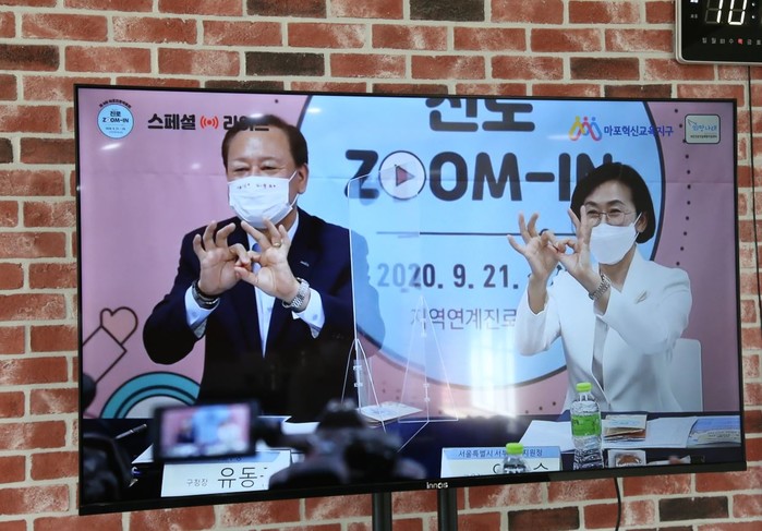유동균 서울 마포구청장은 24일 '진로 ZOOM-IN 박람회'에 참석해 지역 청소년들과 소통했다. 이 행사는 '마을이 함께하는 온라인 진로박람회'라는 주제로 학교별 온라인 수업 운영 플랫폼을 활용해 진로교과 체험활동을 진행했다. 사진은 유 구청장(왼쪽)이 온라인 화면을 통해 청소년들과 소통하는 모습. (사진제공=마포구청)