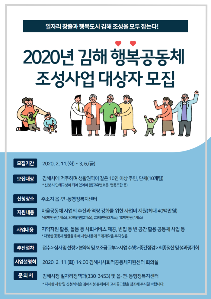 행복공동체 조성사업은 주민 주도 하에 지역자원을 활용하거나, 돌봄 등 사회서비스를 제공하거나, 빈집 등 빈 공간을 활용한 공동체 사업 등을 진행, 주민 역량을 키우고 일자리를 창출해 지역문제를 스스로 해결하는 사업이다.