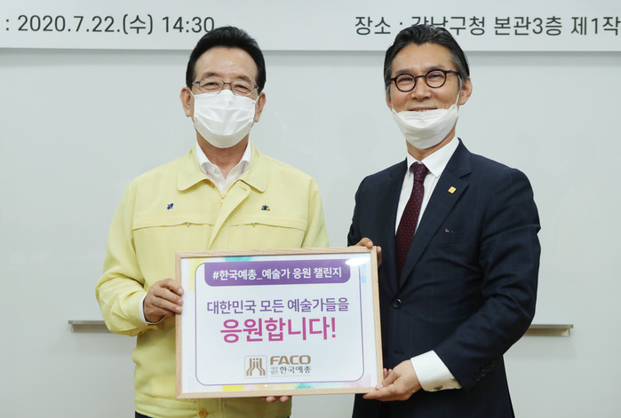 서울 강남구는 22일 구청 회의실에서 (사)한국예술문화단체총연합회와 업무협약(MOU)을 체결했다. 구는 협약을 통해 구민에게 ▲문화예술 정책 공동협력 ▲문화예술 인프라 공유 등의 다양한 예술향유 기회를 제공한다. 사진은 업무협약 후 정순균 구청장(왼쪽)이 기념촬영을 하고 있는 모습. (사진제공=강남구청)