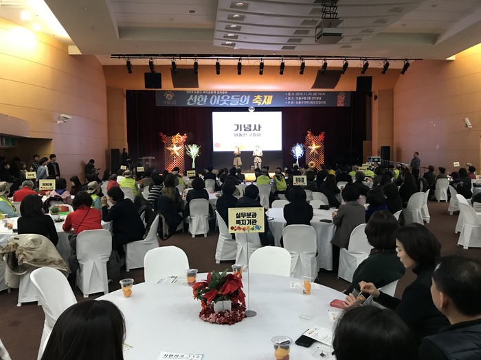 서울 도봉구는 1년 동안 지역에서 이웃을 돌보는 데 앞장선 도봉복지공동체의 활동성과를 함께 공유하고자 최근 구청 2층 선인봉홀에서 ‘선한 이웃들의 축제’를 개최했다. 사진은 행사에 참석한 이동진 구청장이 인사말을 전하는 모습. (사진제공=도봉구청)